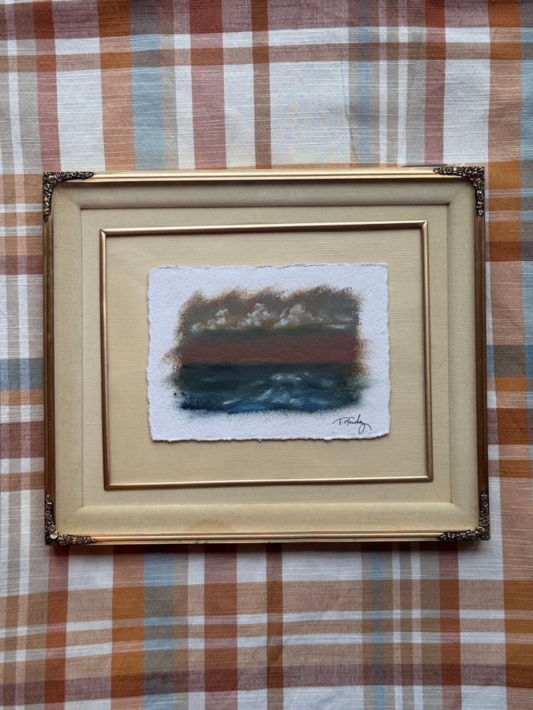 4x6 original painted with oil sticks on cotton paper. Framed in an 8x10 gold and cream antique frame. Frame is included. (there is a small stain on the bottom edge of the mat.)